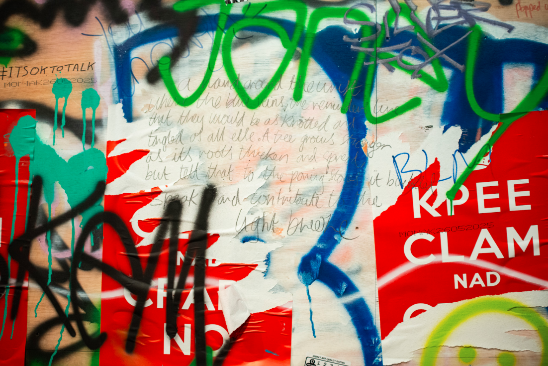A key theme the show offers up is how spray paint links both murals and graffiti, two distinct but related artforms. Hobson’s paint splattered tool archive sits next to a graffiti wall, which visitors are dared to contribute to (with or without permission). In front of it: a scale replica of the head of the Angel of The North, the internationally renowned public sculpture which was fabricated in Hartlepool before being erected in Gateshead.